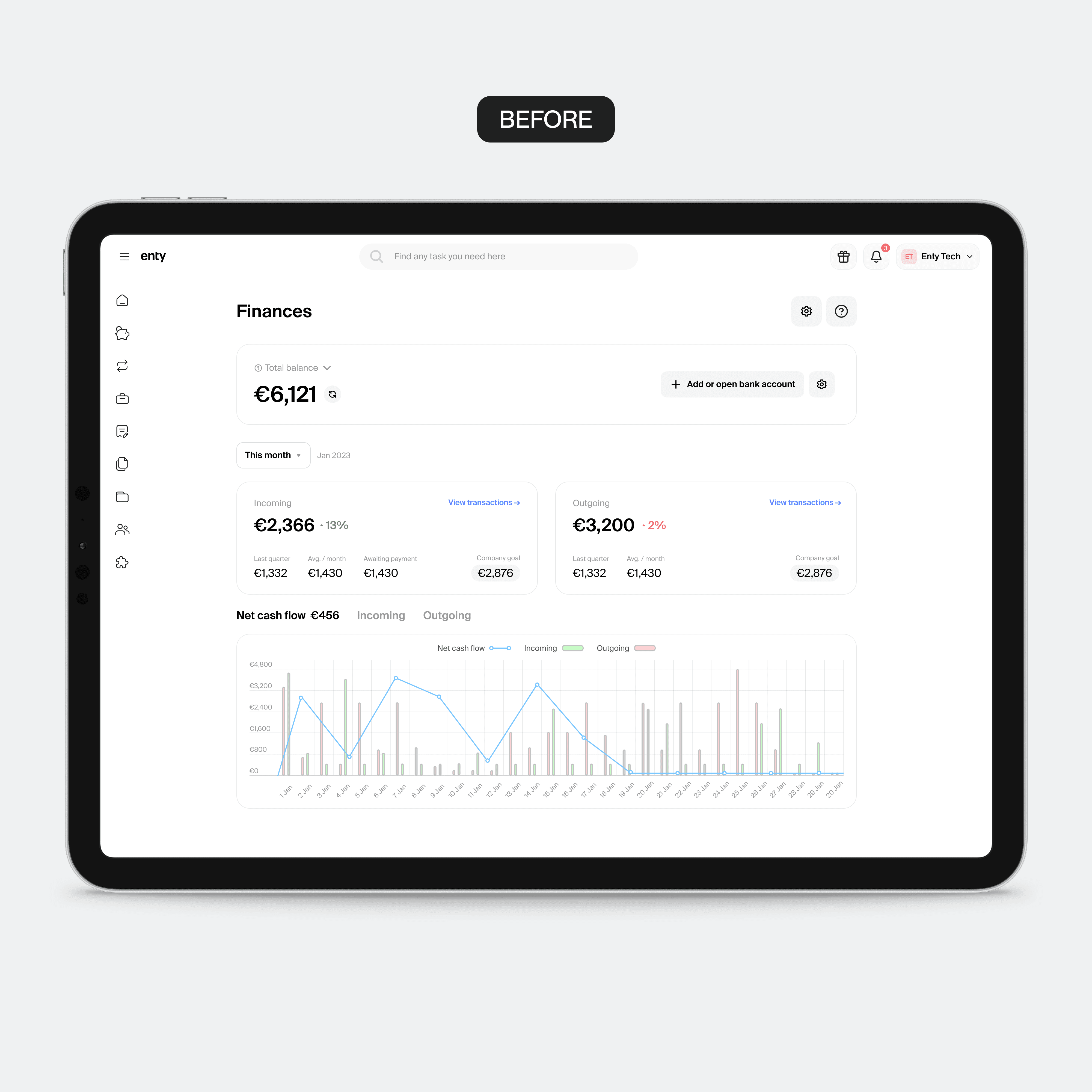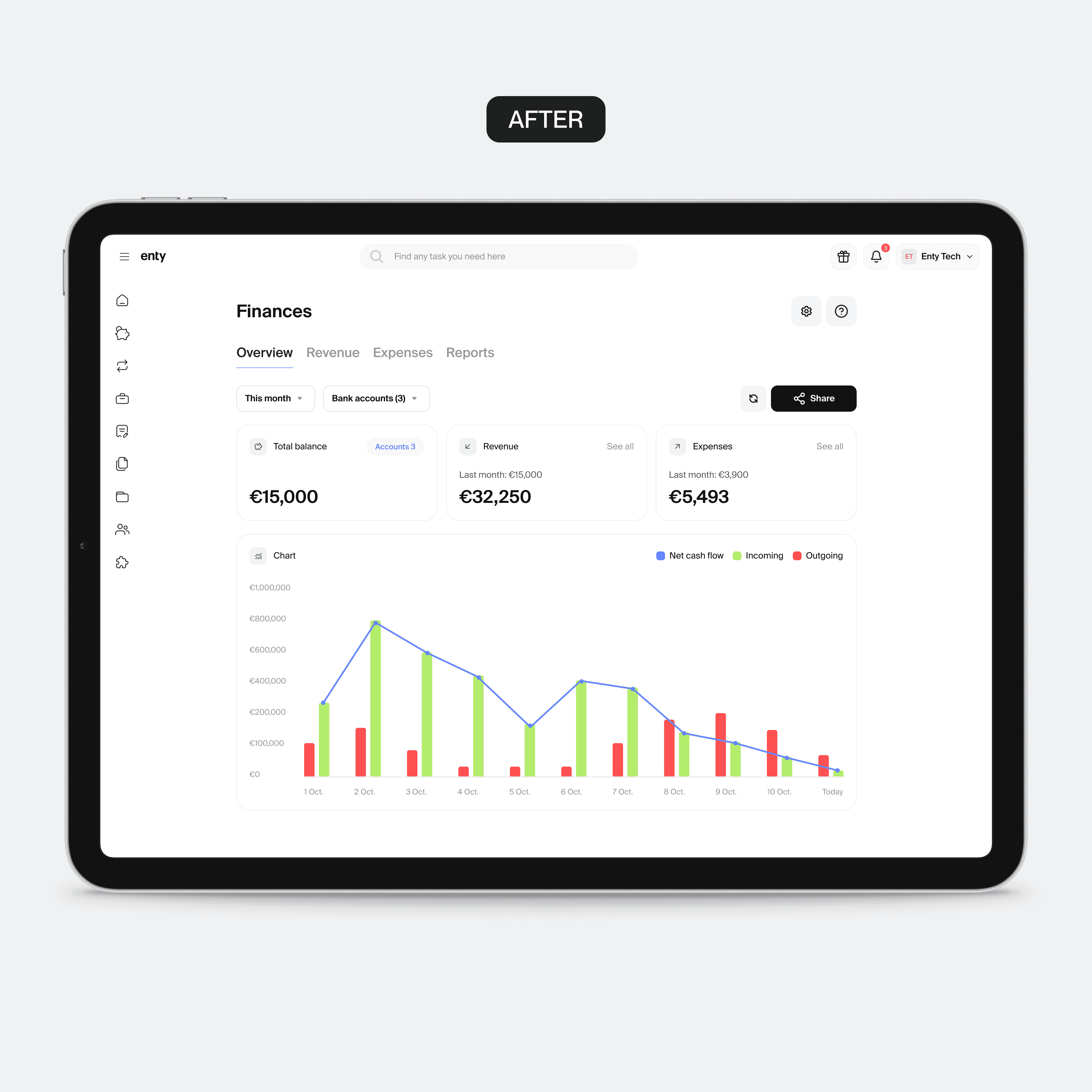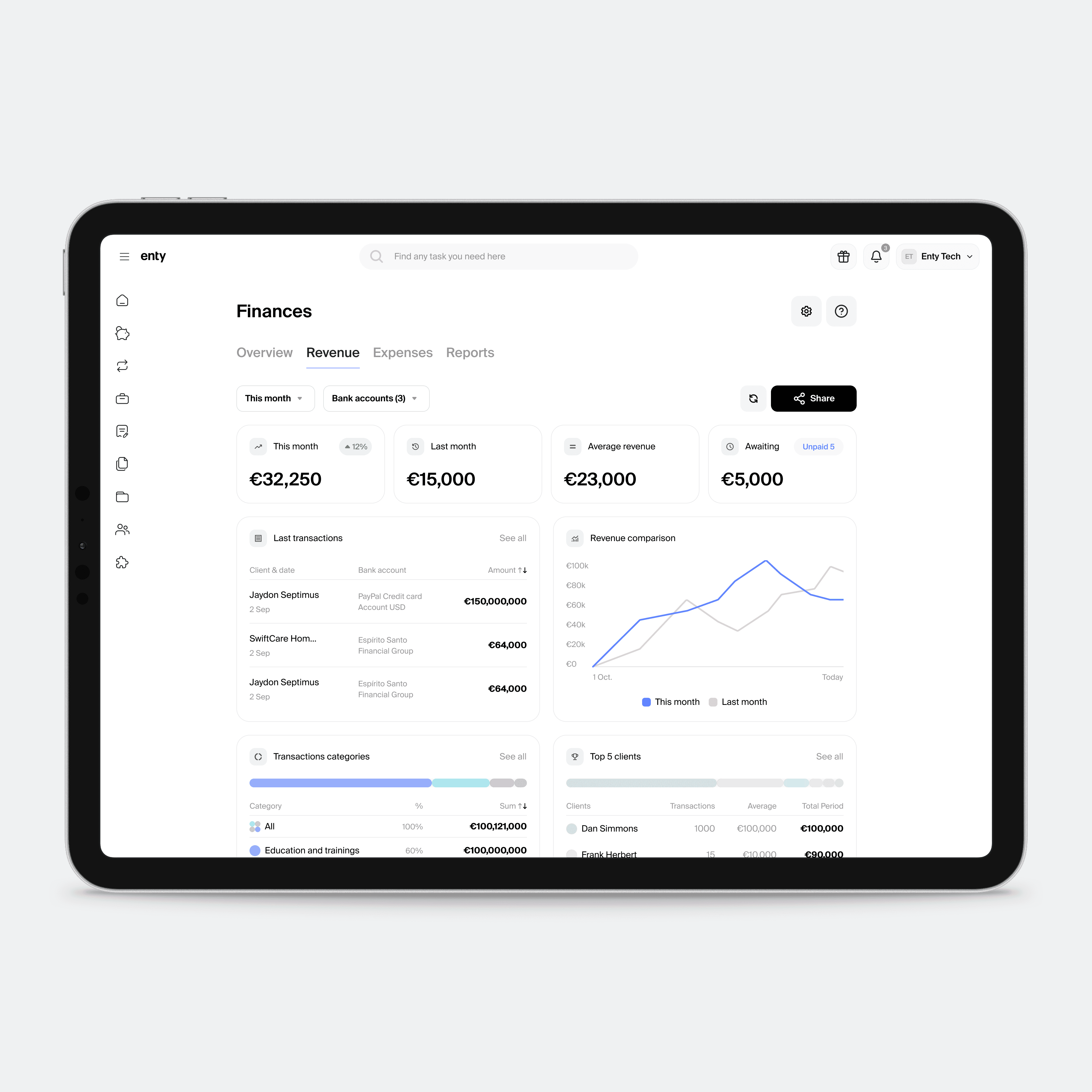 I reorganized the dashboard into clear sections for revenue and expenses, each with consistent charts and key figures. In the revenue section, I added monthly income, last month’s results, average revenue, and expected incoming payments. Both revenue and expenses sections now include last transactions, a revenue comparison chart, category breakdowns, and top-5 lists (clients and expenses). On the overview, I refined the layout and improved the net cash flow visualization, giving users a cleaner, more reliable view of their company’s finances at a glance