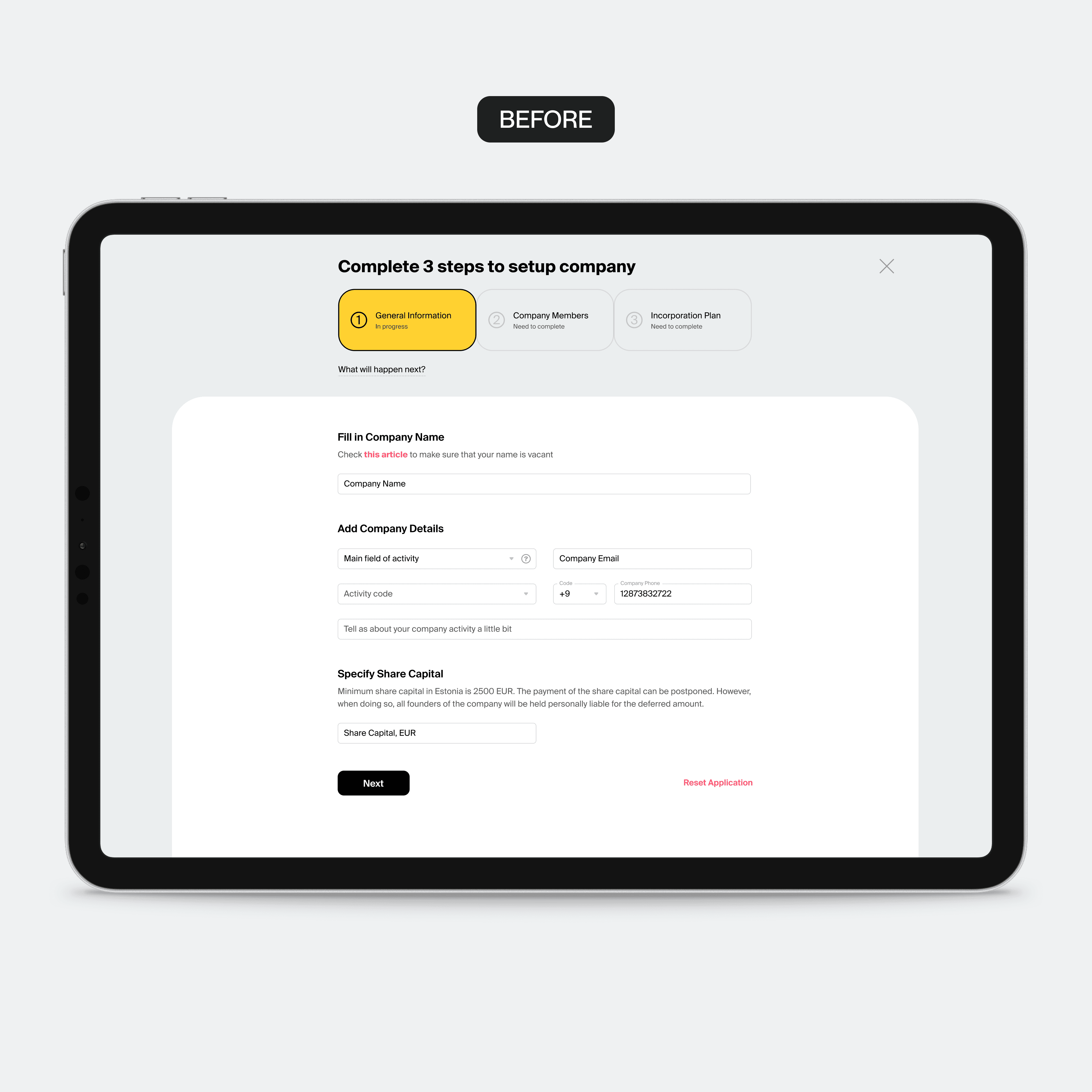 I set out to redesign onboarding for clarity and speed, and to bring incorporation fully into the product as a scalable flow — improving completion rates and creating a more reliable user experience