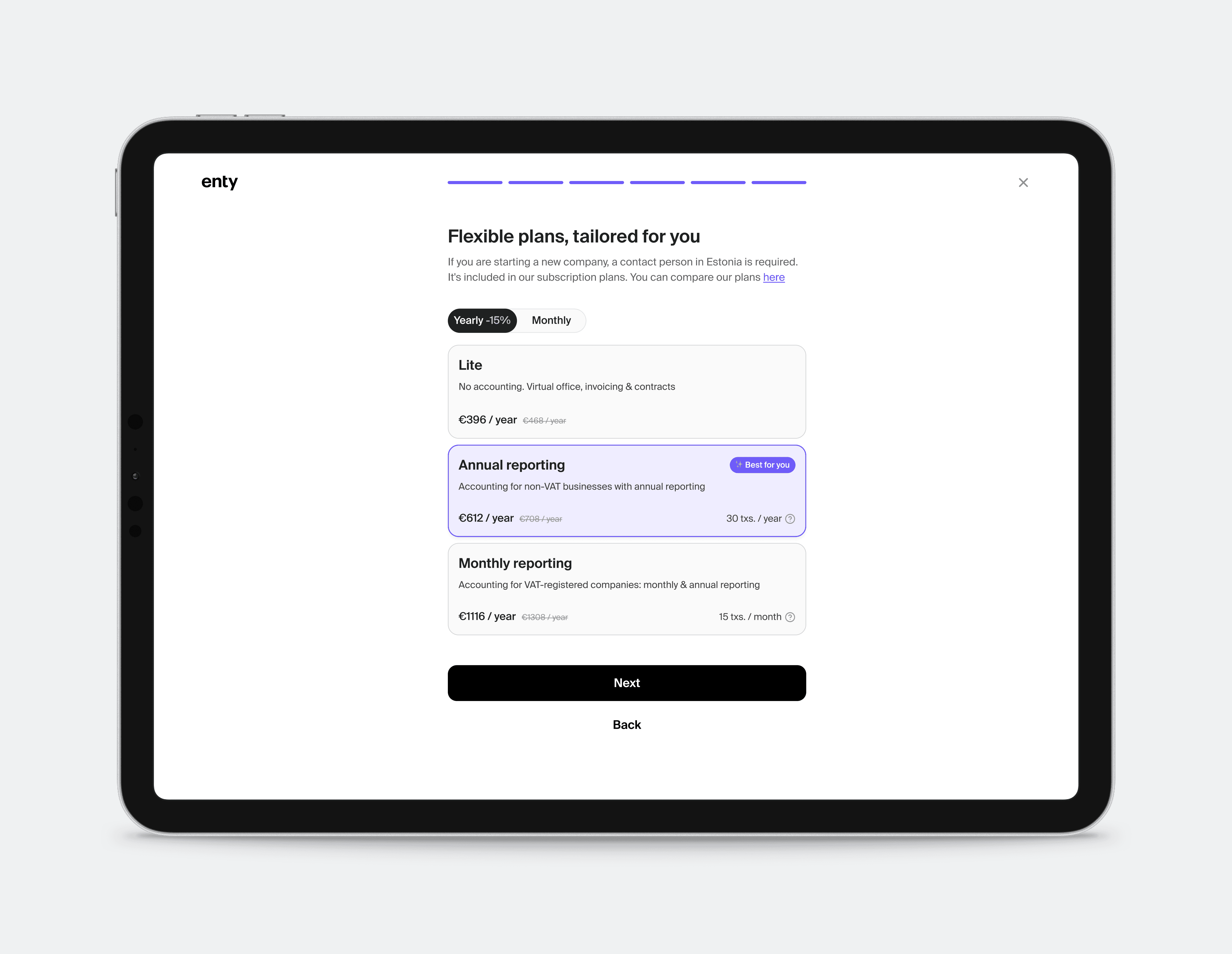 I also redesigned the subscription upgrade step. To simplify decision-making, i applied a nudge approach: the most suitable plan is pre-selected by default, while users can easily switch to another option on the same screen if needed. This reduced friction and guided users toward faster plan adoption